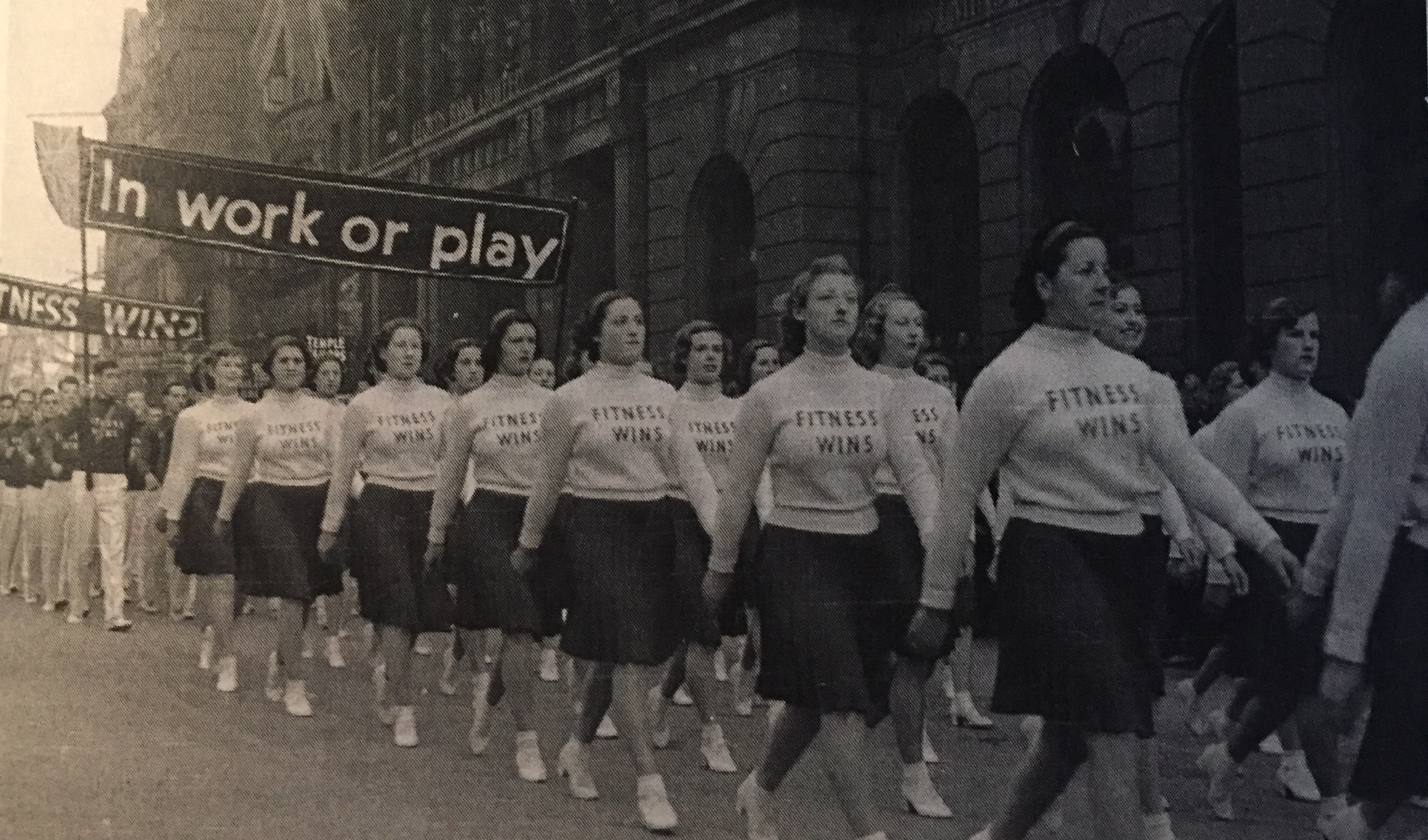 Women from the League of Health and Beauty in Britain parade carrying banners that read: “Throughout the Empire" “In Work or Play" “Fitness Wins". London, 1937. From Strong, Beautiful and Modern: National Fitness in Britain, New Zealand, Australia, and Canada, 1935-1960 by Charlotte MacDonald