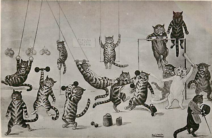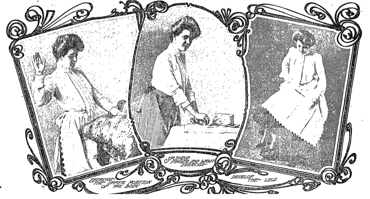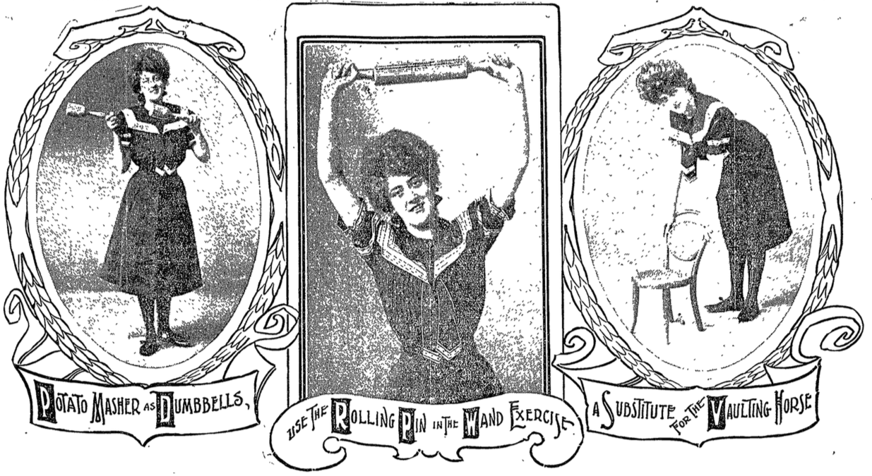 “Complete Gymnasium in Every Home: A Rolling Pin Serves as a Wand--Potato Mashers Take the Place of Dumbbells--Chairs Serve as Vaulting Horses--Pulling the Window Shades Up and Down Develops the Chest as Pully Weights Do--All These Things and Many More Give Vigor and Beauty", Katherine Morton, Boston Daily Globe, January 3, 1904.