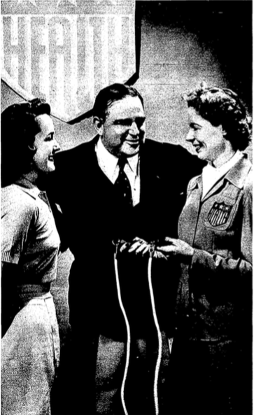Alice Marbles, a World's Tennis Champion was appointed U.S. Assistant Director of Civilian Defense in Charge of National Physical Training for Women. "Miss Marbles tells Mayor LaGuardia her plans for her new job. Even a piece of clothesline, she says, can start a person on the road to glowing health." From "To America's Fifty Million Women," Los Angeles Times, October 26, 1941.